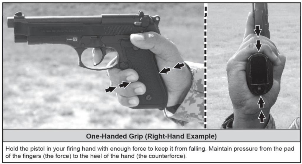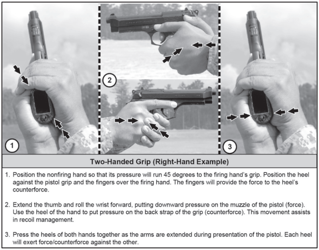 Pistol: High grip for recoil control.